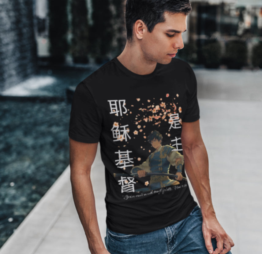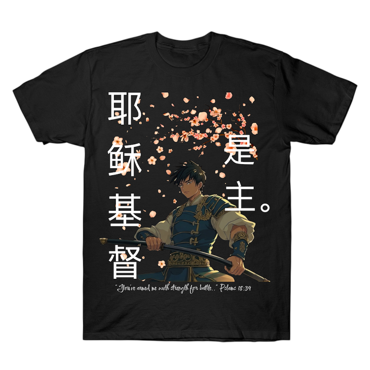This design was inspired by psalms 18:39, David was a warrior, when Saul tried to armor up David, he took it all off. (1 Samuel 17:39) He couldn’t fight w man’s armor because the Lord armed him with his strength. The Chinese lettering say “Jesus Christ is Lord.”